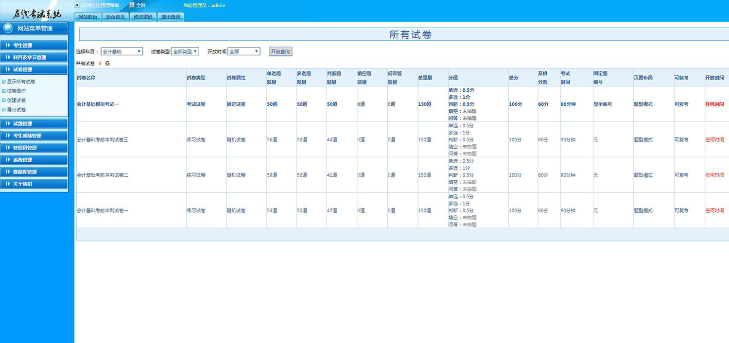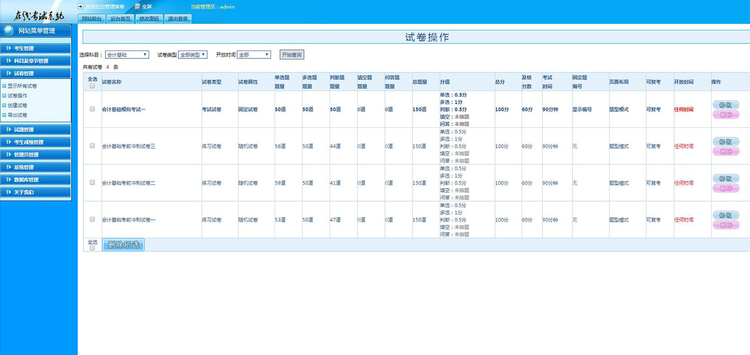 隨機組卷:此組卷方式在組卷時需要指定單選、多選及判斷時需要抽取的題數(shù),在考試時每個學(xué)生的試題內(nèi)容及順序不相同,但總題數(shù)是相同的,且都屬于同一科目。